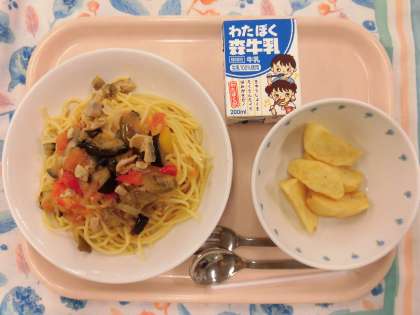 9月になりましたが、まだまだ暑く、夏野菜がおいしいうちに夏野菜を使ったスパゲティにしました。普段トマトのソースはホールトマトを使いますが、このスパゲッティはフレッシュな生トマトを使っています。たっぷりのなすはオリーブ油をまぶしてオーブンで焼いて入れています。ソースだけでなく、麺にも炒めたベーコンを絡めています。