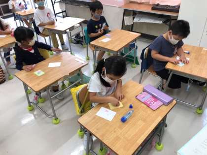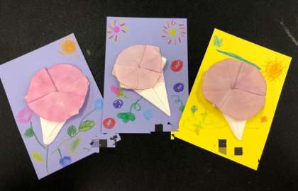 あさがおの花で作った色水で、和紙で作った花を染めました。挿絵を入れると素敵なしおりができました。