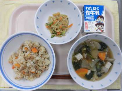 9月24日(木) 今日の給食 公開日 2020/09/25 更新日 2020/09/25 八雲ランチ ≪今日の給食≫ ・豚肉のしぐれご飯 ・糸寒天のごま酢和え ・けんちん汁 ・牛乳 ≪食材産地≫ ごぼう…青森県 人参…北海道 しょうが…高知県 あさつき…福岡県 きゅうり…岩手県 里芋…千葉県 小松菜…埼玉県 長ねぎ…秋田県 もやし…栃木県 大根…北海道 豚肉…鹿児島県 油揚げ…愛知・佐賀県 こんにゃく…群馬県 豆腐…愛知・佐賀県 いいね(0)