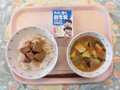 今日は季節の献立です。角煮めしということで、豚の角煮をイメージしていた児童もいたようですが鰹を角煮にしました。鰹は5月ごろは「初鰹」、9月ごろは「戻り鰹」と春と秋年2回春画あります。今日は鰹をしょうゆやしょうが、砂糖などで甘辛く煮、ご飯の上にのせて食べました。