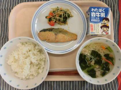 今日は一汁二菜の献立です。ご飯、汁物、おかず二菜という組み合わせが和食の基本の形です。鮭は西京味噌をつけて焼きました。ごま和えはほうれん草、もやし、人参を給食室で擦って炒ったものを和えました。すましそうめんは昆布と鰹節でとっただし汁にそうめんを入れたすまし汁です。