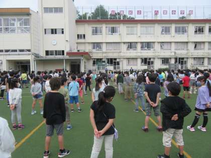 始業式は校庭で間隔をあけて並び、全校児童が一堂に会して行われました。
