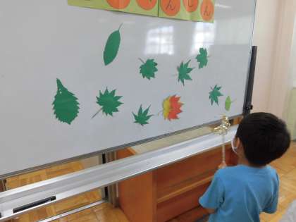 1年生は、「秋の大変身」と題して、魔法をかけて緑の葉を紅葉させました。葉っぱは1枚1枚、少しづつ違った色に変わるんだねと、その変化を楽しみました。