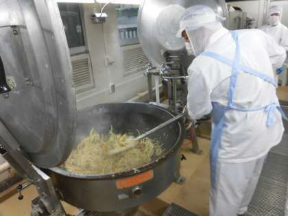 焼きうどんは名前の通り、うどんを炒めるのですが、給食で炒めるとなると大量のため、難しい献立の一つです。八雲小学校では460人分の焼きうどんを作るためにうどんはゆで、野菜は炒めておき、それを6回に分けて炒め合わせています。給食では衛生のために75度以上の温度を必ず確認するため、うどんを茹でたらすぐ炒め合わせらせるように調理師さんの連係プレーと一気に炒め合わせる調理師さんのプロの技によって出来上がります。一回の炒める量は約19キロ。今日もうどんが釜にくっつくことなく、きちんと加熱された焼きうどんが出来上がりました。