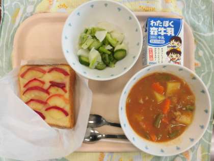 10月27日(火) 今日の給食 公開日 2020/10/28 更新日 2020/10/28 八雲ランチ ≪今日の給食≫ ・アップルトースト ・ポークシチュー ・かぶのサラダ ・牛乳 ≪食材産地≫ りんご…青森県 セロリ…長野県 玉ねぎ…北海道 人参…北海道 じゃがいも…北海道 さやいんげん…茨城県 きゅうり…茨城県 キャベツ…長野県 豚肉…鹿児島県 豚骨…鹿児島県 鶏ガラ…鳥取県 いいね(0)