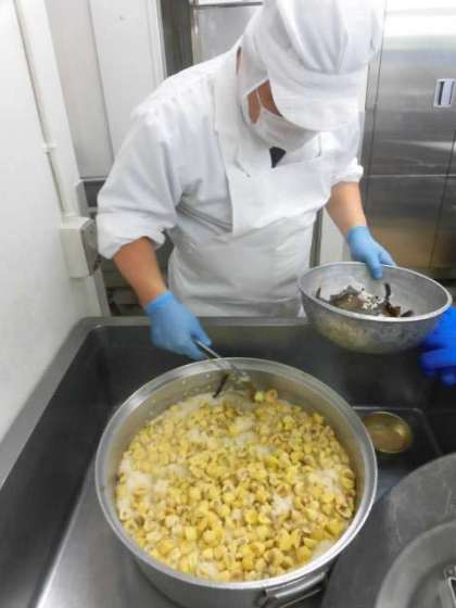 今日は「十三夜」です。十三夜は十五夜の次にきれいな月が見えるといわれ、「栗名月」や「豆名月」とも呼ばれます。そこで、今日は旬の栗を使い、「栗ご飯」を作りました。