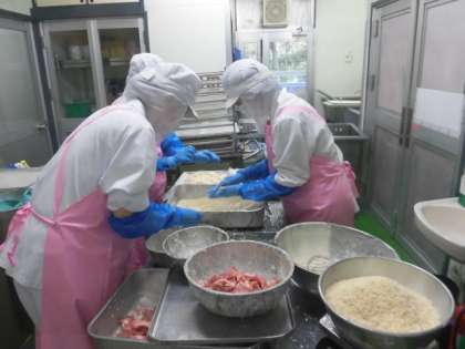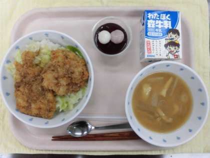 運動会応援献立は運動会へのゲン担ぎの意味を込めて、とんカツの「カツ」と「勝つ」をかけてソースカツ丼にしました。毎年恒例になっていますが、子どもたちは楽しみにしてくれているようです。写真で見ると大きなお肉に見えますが、お肉屋さんに相談して、なるべく厚みを開いていただいて、判を広げて持ってきてもらっています。その分パン粉をつけるのも大変ですが、調理師さんは一枚一枚丁寧にパン粉をつけてくれました。野菜もたっぷり食べてもらいたいので、キャベツもたっぷり千切りにし、ゆでてご飯の上にのせました。