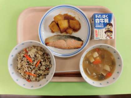 今日は和食の献立です。ひじきご飯はひじきと一緒にひき肉や人参、ごぼうを一緒に煮てご飯に混ぜたものです。ひき肉も入っていることで子どもも食べやすいご飯です。