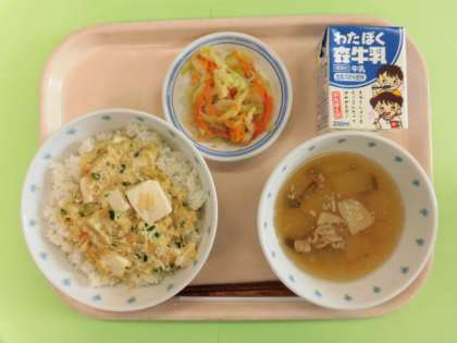 豆腐と卵のどんぶりは、卵のふわふわに合わせて絹ごしの豆腐を入れて作ったどんぶりです。冬瓜のお吸い物は夏が旬の冬瓜ですが、冬まで貯蔵できることからその名がついたことを子どもたちにも伝えました。煮物にむいている冬瓜は煮るとトロッと柔らかくなります。中までしっかり味が染みるように煮ました。野菜の香味和えはにんにくを入れ、香り良い和え物です。