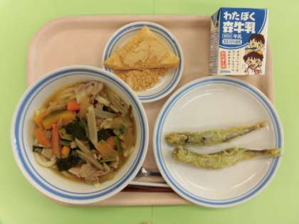 今日の給食ではうどんで作りました。かぼちゃは夏が旬の野菜ですが、保存がきくことから、冬至に食べられていたようです。ビタミンAが豊富なかぼちゃは風邪予防にぴったりです。