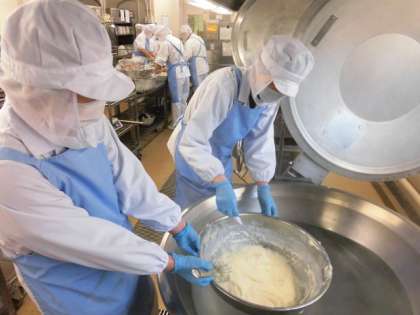 ゆずは果汁を絞り、ミルク葛餅に入れ、ゆずが香るようにしました。ミルク葛餅は牛乳と片栗粉を加熱し、練って作ります。もちもちとしていておいしいデザートです。