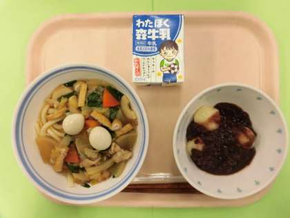 今日は「としょ献立」です。1月11日の「鏡開き」、15日の「小正月」にちなみ、もち米からできている白玉粉で豆腐と一緒に白玉にし、小豆を煮て汁粉にしました。白玉は豆腐が入っているのでもちもちやわらかです。