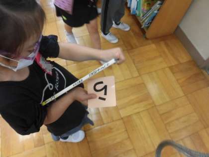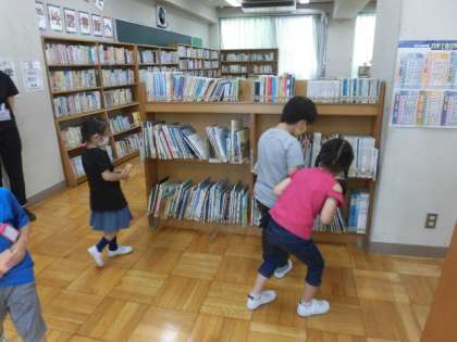 本校では絵本は、目黒区立図書館に合わせて、書名の「あいうえお順」に並んでいます。そこで、一人ひとりにあいうえおカードを配り、その文字から始まる書名の絵本を探す活動をしました。