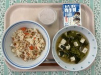 八雲小学校の開校記念日は1月12日です。今日は開校記念日集会に合わせた開校記念日献立です。6年生が家庭科の授業で給食献立を考えた際に、お祝いの時に食べる「赤飯」の献立を立てたグループがあったため、この日の献立に採用となりました。赤飯の赤色はお祝いを表す色のことから、赤飯はハレの日に食べられることが多いです。給食室で小豆を煮て、小豆の煮汁をもち米と一緒に炊き込むことで、きれいな赤色の赤飯になりました。
