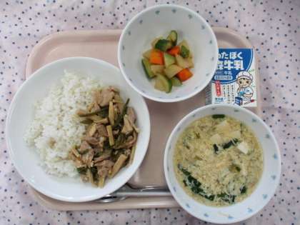 チンジャオロースーは千切りにしたピーマン、牛肉、たけのこなどを炒め合わせた中華料理です。今日は豚肉と高野豆腐を細く切ったもので作りました。高野豆腐は高たんぱく質・低脂肪の食品です。食感も肉に似ているので、子どもたちもよく食べていました。また、ピーマンは東京都八王子市産の地産地消野菜です。ピーマンが苦手な子も多いですが、今日のチンジャオロースーは気にせず食べられた子が多かったようでした。
