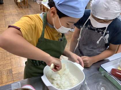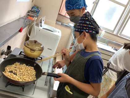 6年生は栄養バランスのよい朝食の献立を立て、ご飯、主菜、副菜の調理実習を行いました。ご飯担当の児童は朝早くに登校し、お米をとぎ、給水しました。班で決めた手順と分担表を確認しながら協力して調理実習ができました。お鍋で炊いたご飯は少しおこげができ、どの班も美味しく炊けました。