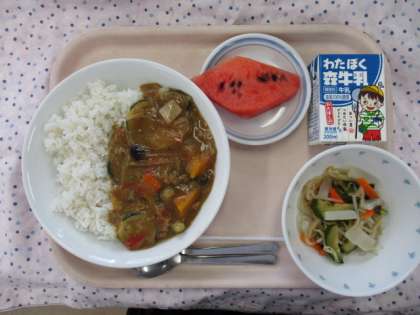 夏休み前最後の給食は「夏野菜カレー」です。トマト、なす、ズッキーニ、かぼちゃといった夏野菜をたくさん使っています。トマト、なす、じゃがいも、にんにくは東京都八王子市の地産地消野菜を使って作りました。なす、ズッキーニはオリーブオイルで焼き、かぼちゃは蒸してからカレーに入れました。野菜がゴロゴロ入っていますが、カレーということもあってよく食べていました。
