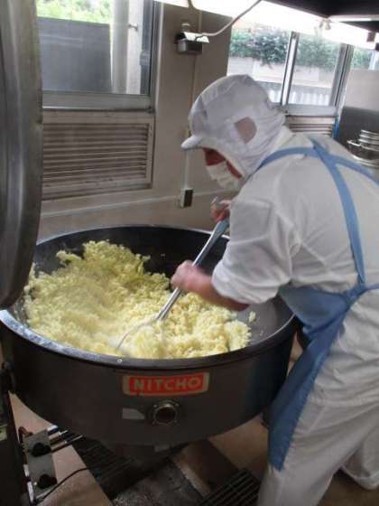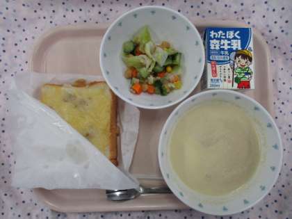 ポテトベーコントーストはじゃがいもを蒸かしてよくつぶし、牛乳、バターを加えてマッシュポテトにしたものをパンの上に炒めたベーコンと一緒にのせ、さらにチーズをかけて焼いたものです。溶けたチーズとマッシュポテトがよく合います。おかわりのじゃんけんにたくさんの子が参加していました。