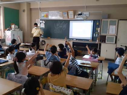 今日は、1人1台学習用端末を活用した児童集会です。集会委員会が考えたゲームをみんな楽しみました。