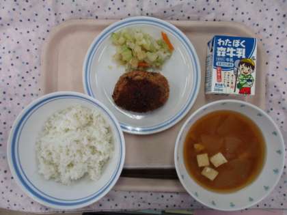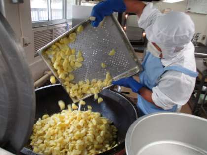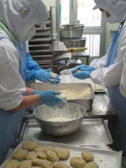 ポテトコロッケは給食室で一から手作りしています。30キロもあるじゃがいもを蒸すところから始まり、つぶして玉ねぎやひき肉を炒めたものと一緒に混ぜ、1個ずつ小判型にまるめて小麦、水で作った「ドロ」をつけ、パン粉をまぶして油で揚げて出来上がりです。460個も作るため、揚げるのだけでも1時間20分ほどかかります。どのコロッケも外はカリカリ、中はほくほくのコロッケでした。