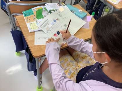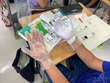 さまざまな布の種類とその性質について、実験をしながら学びました。特製の布見本つきワークシートで布の感触も確かめることができました。普段何気なくしている涼しく過ごす工夫に理由があることがわかりました。来週は、くつしたを洗う実習に挑戦します!