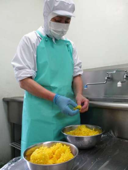 9月9日は「重陽の節句」です。五節句のうちの一つで、菊の花の時期であることから「菊の節句」とも言われています。重陽の節句には、菊の花をお酒に浮かべて飲むと不老長寿になると言われています。今日は食用菊を使って和え物を作りました。給食室に届いた菊の花は、花びらを取り、お酢を入れたお湯で茹で、色よい和え物になりました。低学年のクラスには花びらを取る前の菊の花をもって教室に行きました。「わあ、きれい!」「菊の花って食べられるんだね」と驚いていました。