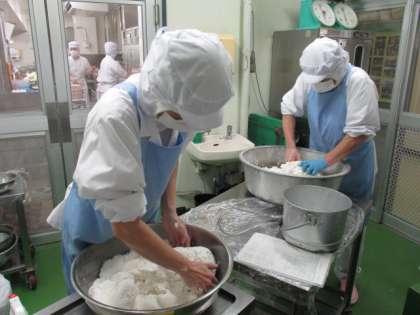 本の中でもお団子を作っている様子が描かれていますが、今日の月見団子も給食室で手作りしています。白玉粉と上新粉をしっかりこねて大きめなお団子にしました。丸めた団子は蒸して手作りのみたらしのたれに和えます。