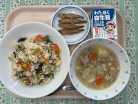 ピザトーストは食パンに給食室手作りのトマトソースを塗り、チーズをかけて焼きました。しっかりした味のピザトーストと、白いんげん豆の優しい味わいのポタージュがとても合い、皆さん残さず食べてくれました。