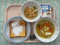 全国学校給食週間にちなんだ献立は今日で最後でした。今日は現在の給食です。ご飯を中心にした和食を味わい、また、東京の食材を知ることがねらいの給食です。葛飾区小松で生まれた小松菜や東京都の島の一つである伊豆大島の寒天を使いました。