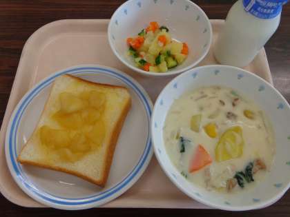 10月28日の給食 公開日 2015/10/28 更新日 2015/10/28 八雲ランチ 今日の給食:アップルトースト 秋の味覚シチュー じゃがいもサラダ 牛乳 産地 玉ねぎ:北海道 にんじん:北海道 さつまいも:北海道 小松菜:埼玉県 じゃがいも:北海道 きゅうり:埼玉県 りんご:青森県 栗:熊本県 豚肉:岩手県 いいね(0)