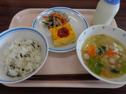 今日の給食:わかめごはん キャベツとベーコンのスープ