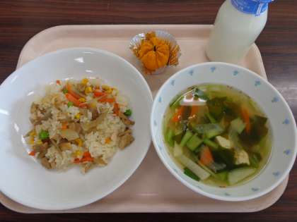 今日の給食:とりごぼうチャーハン チンゲン菜とわかめのスープ