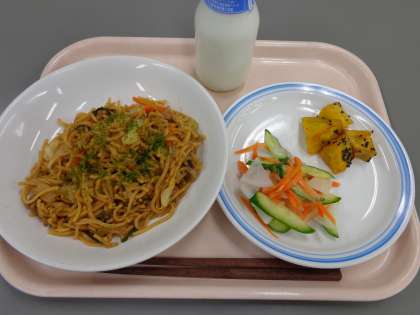 今日の給食:ソース焼きそば ゆで野菜ごまドレッシング 大学芋 牛乳