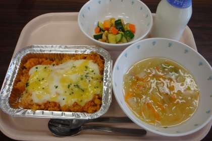 今日の給食:チキンライスチーズソース 千切り野菜のスープ