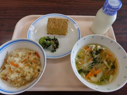 5月29日の給食 公開日 2015/05/29 更新日 2015/05/29 八雲ランチ 今日の給食:炊き込みごはん 沢煮椀 松風焼き きゅうりとわかめの酢の物 牛乳 産地 にんじん:千葉県 ごぼう:青森県 長ねぎ:千葉県 しょうが:高知県 玉ねぎ:香川県 きぬさや:栃木県 きゅうり:群馬県 三つ葉:千葉県 鶏肉:徳島県 鶏卵:秋田県 いいね(0)