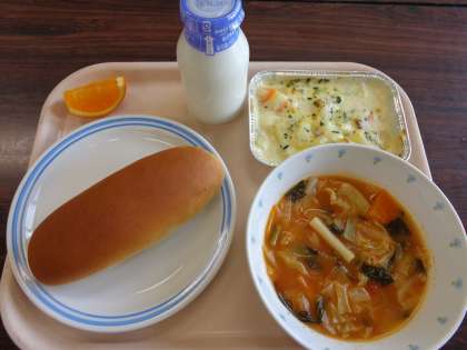5月18日の給食 公開日 2015/05/18 更新日 2015/05/18 八雲ランチ 今日の給食:ミルクパン 野菜たっぷりスープ 新じゃがと豆腐のグラタン 清見オレンジ 牛乳 産地 じゃがいも:長崎県 にんじん:徳島県 玉ねぎ:佐賀県 パセリ:静岡県 セロリー:長野県 小松菜:埼玉県 キャベツ:神奈川県 清見オレンジ:佐賀県 いいね(0)