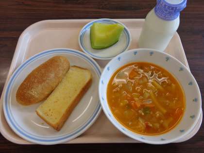 今日の給食:あげパン ガーリックトースト ミネストローネ メロン 牛乳