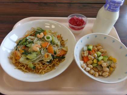 今日の給食:海鮮焼きそば 大豆とじゃこのサラダ あじさいゼリー 牛乳