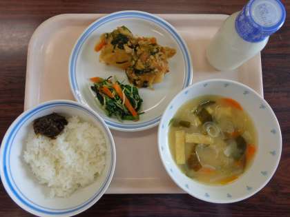 今日の給食:ごはん のりの佃煮 みそ汁 揚げ出し豆腐野菜あんかけ