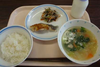 今日の給食:ごはん キャベツとベーコンのスープ 魚のマスタード焼き
