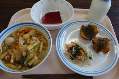 今日の給食:五目うどん たこ揚げ じゃこ入り和風サラダ ブドウゼリー 牛乳