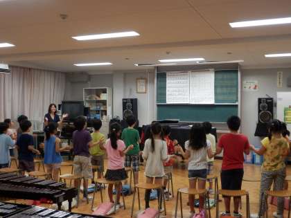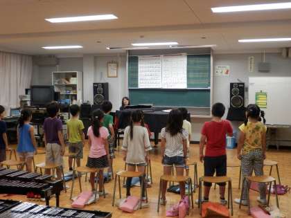高学年の歌声を目標に歌を歌った後、楽しくリズム遊びをしました。