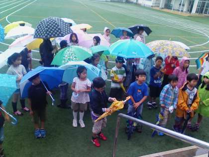 雨のため学校に戻り昼食を取りました。これから午後の出発です。