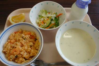 今日の給食:ジャンバラヤ ヴィシソワーズ ゆで野菜ドレッシングがけ