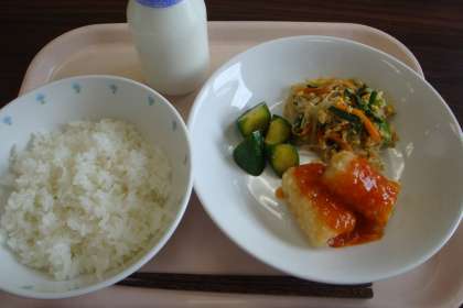 今日の給食:ごはん いかチリソース 春雨と野菜の五目炒め