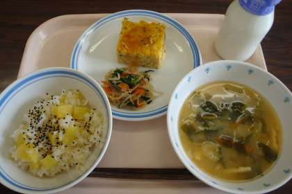 10月8日の給食 公開日 2013/10/09 更新日 2013/10/09 八雲ランチ 今日の給食:さつまいも玄米ごはん みそ汁 ぎせい豆腐 ごま和え 牛乳 産地 玄米:北海道 さつまいも:徳島県 にんじん:北海道 玉ねぎ:北海道 パセリ:長野県 小松菜:東京都 もやし:栃木県 白菜:長野県 大根:青森県 長ねぎ:山形県 みょうが:千葉県 豚肉:岩手県 いいね(0)