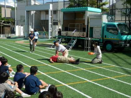 校庭に避難後、AEDについての話を聞き、起震車体験、煙ハウス体験を行いました。