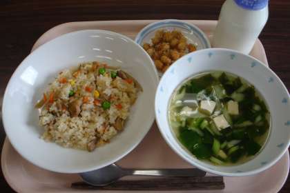 10月10日の給食 公開日 2013/10/10 更新日 2013/10/10 八雲ランチ 今日の給食:鶏ごぼうチャーハン チンゲン菜とワカメのスープ 大豆とじゃこのカリカリ揚げ 牛乳 産地 ごぼう:青森県 にんじん:北海道 玉ねぎ:北海道 チンゲン菜:静岡県 グリンピース:ニュージーランド 鶏肉:徳島県 いいね(0)