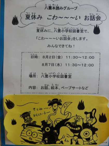図書室開放、お話会 公開日 2013/08/01 更新日 2013/08/01 お知らせ 8月2日と7日は、図書室開放の日です。10時から12時まです。 八雲本読みグループの方による「夏休み こわ〜〜〜い お話会」は 11時30分〜12時です。 いいね(0)