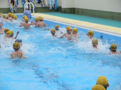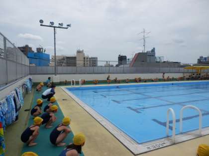 プールの約束を確認し、準備運動、シャワー、水慣れと続きます。